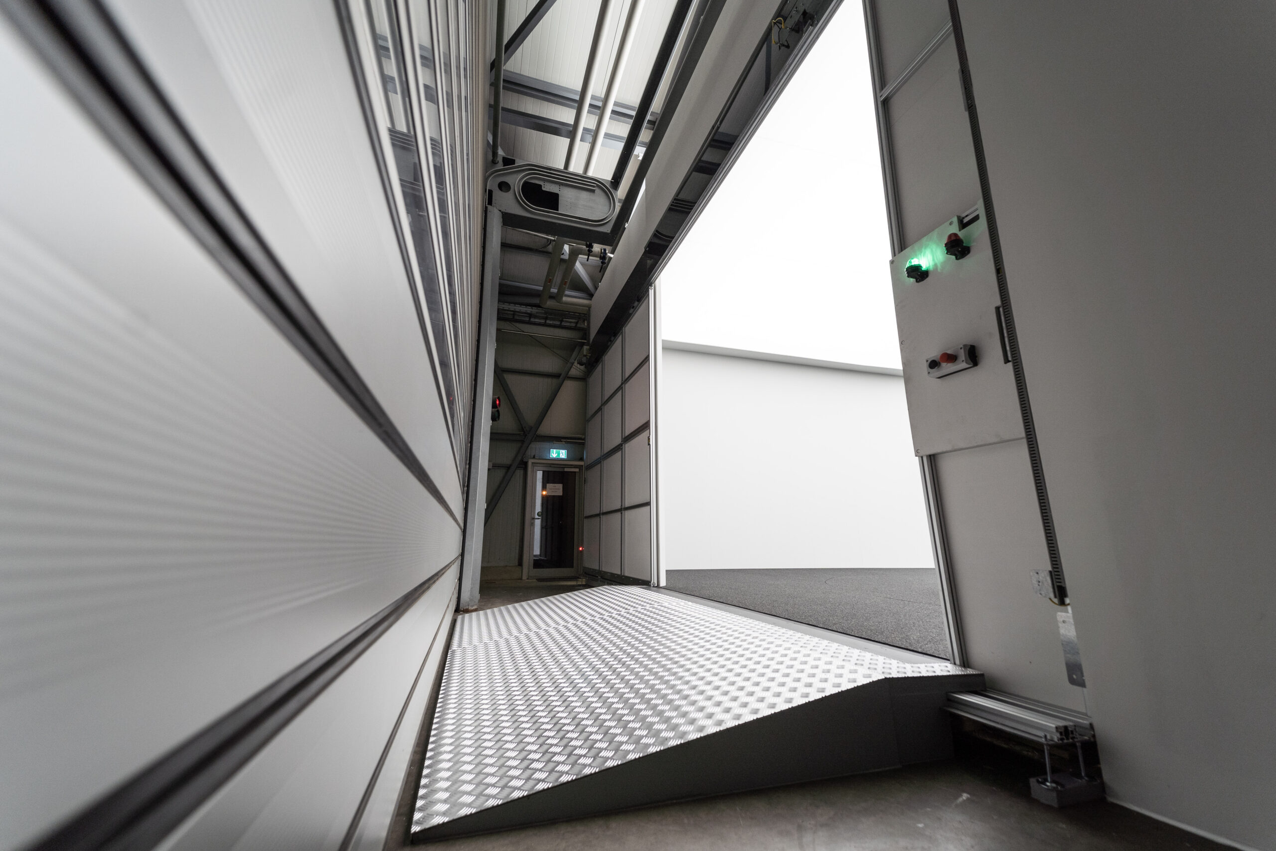 • We have realised a drive-through studio: the car is driven in at the front (roller door) and driven out at the back (sliding door).