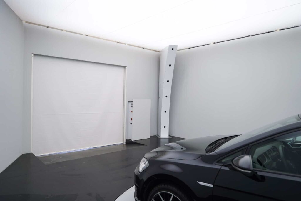 Om afleidende reflecties op de auto van buiten de studio tegen te gaan, heeft Autobedrijf Ficus gekozen voor een fotostudio met roldeur. Hierdoor is de studio helemaal afgesloten en komt de auto het mooiste op de foto. De roldeur is volledig geïntegreerd in de software, waardoor deze open en dichtgaat wanneer dat nodig is. De roldeur is ook nog eens heel veilig. Door sensoren in de roldeur zal deze nooit dichtgaan als er een auto de studio in- of uitrijdt en door de groene en rode LED strips in de zijkanten van de studio-opening, weet de operator of de auto de studio in of uit mag.