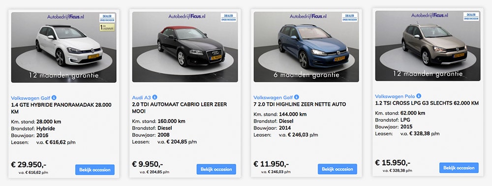 Bij veel autobedrijven heeft elke auto andere foto’s en is er geen lijn te ontdekken in de online presentatie. Hierdoor voelt het alsof de foto’s gemaakt zijn met haast en zonder enige doel. Alsof de auto snel online moet, ongeacht hoe. Bij Autobedrijf Ficus zien we dat elke auto dezelfde foto’s bevat en op dezelfde manier gepresenteerd word. Zo kan de websitebezoeker zich niet van de indruk onttrekken dat ze te maken hebben met een professioneel bedrijf met hart voor de zaak. Zo overtuig je de klant om met jou zaken te doen.